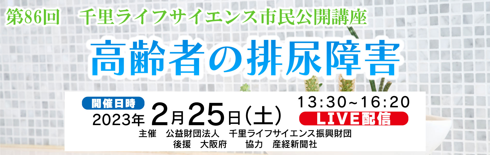 アンケート Q1 ご年齢【必須】 10才代20才代30才代40才代50才代60才代70才代80才以上 Q2 当財団の市民公開講座の参加は何回目ですか。(通常の参加型開催も含めて)【必須】 はじめて2回目3回目4回以上 Q3 ご所属【必須】 会社員官公庁自営業教員医療関係者(医師)医療関係者(医師以外)大学院生・学生無職その他 Q4 本日の市民講座を何で知りましたか。(複数選択可)【必須】 ポスター当財団ホームページその他ホームページ産経新聞当財団からのダイレクトメール千里ライフサイエンスフォーラムその他 Q5 本日の講演について、難易度をお聞かせください。【必須】 よく分かった分かった普通難しかった Q6 今後、どのような疾患分野の講演を希望されますか。(複数選択可)【必須】 がん糖尿病高血圧症心疾患(不整脈・狭心症など)脳血管障害(脳梗塞など)認知症神経疾患(パーキンソン病・てんかんなど)精神疾患(統合失調症・うつ病など)呼吸器疾患(肺炎・喘息など)消化器疾患腎・泌尿器疾患免疫・アレルギー(花粉症・皮膚炎・関節リウマチなど)眼科疾患婦人科疾患感染症筋・骨格(関節炎、腰痛症など) Q7 その他、ご意見がございましたら、ご自由にお書きください。 — アンケート情報利用目的について —ご記入いただきました内容は、当財団のより良い事業を実施する範囲内で活用させていただきます。アンケートの集計内容は、当財団の理事会、評議員会、企画委員会、および本日の講師に提供する場合があります。